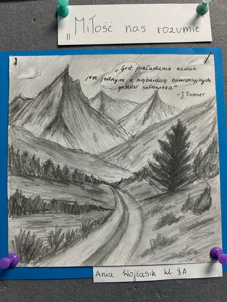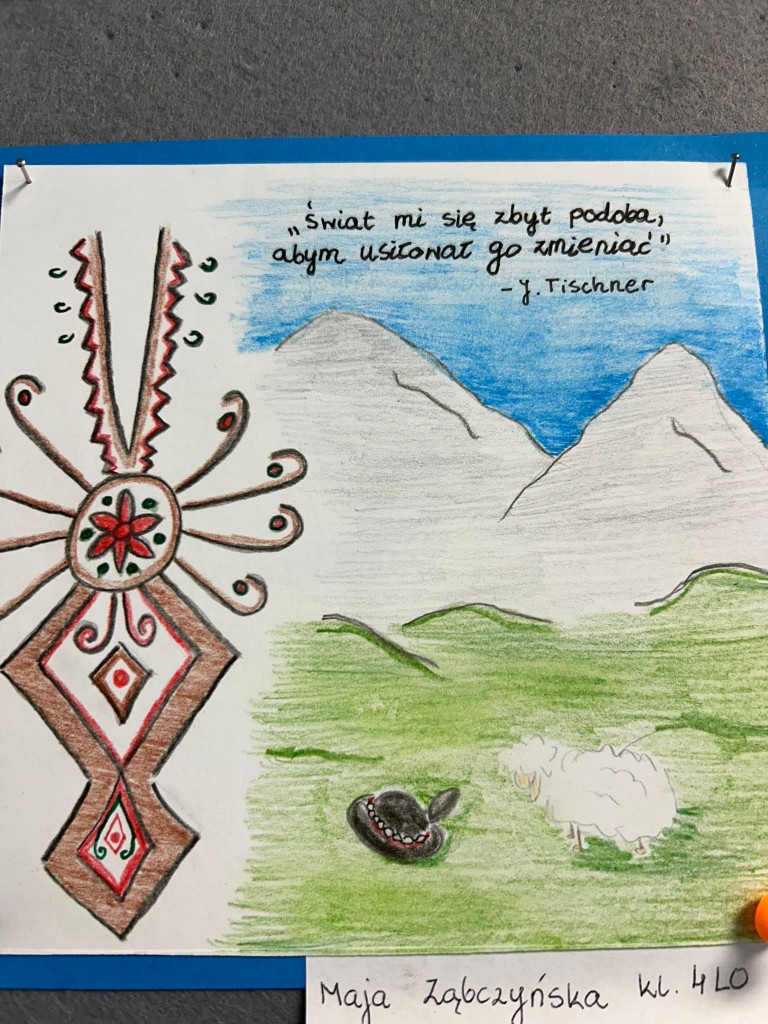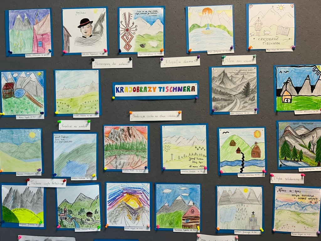 W pierwszych tygodniach nowego roku szkolnego uczniowie szkoły podstawowej oraz szkoły średniej, w ramach obchodów Roku Tischnerowskiego wykonali prace plastyczne, w których przedstawiły ulubione krajobrazy i miejsca z dzieciństwa naszego patrona księdza profesora Józefa Tischnera. Prace w formacie znanym nam z klasycznych widokówek zostały wykonane po wcześniejszym zapoznaniu się z esejem „Korzenie”, z książki Wojciecha Bonowicza pt: „Kapelusz na wodzie”. Po zakończeniu prac, najciekawsze z nich zostały wyeksponowane na tablicy w holu szkolnym, a ich autorzy otrzymali nagrody – upominki. Niektóre krajobrazy znacznie wzruszyły oglądających swoim kunsztem artystycznym oraz estetycznym wykonaniem.
