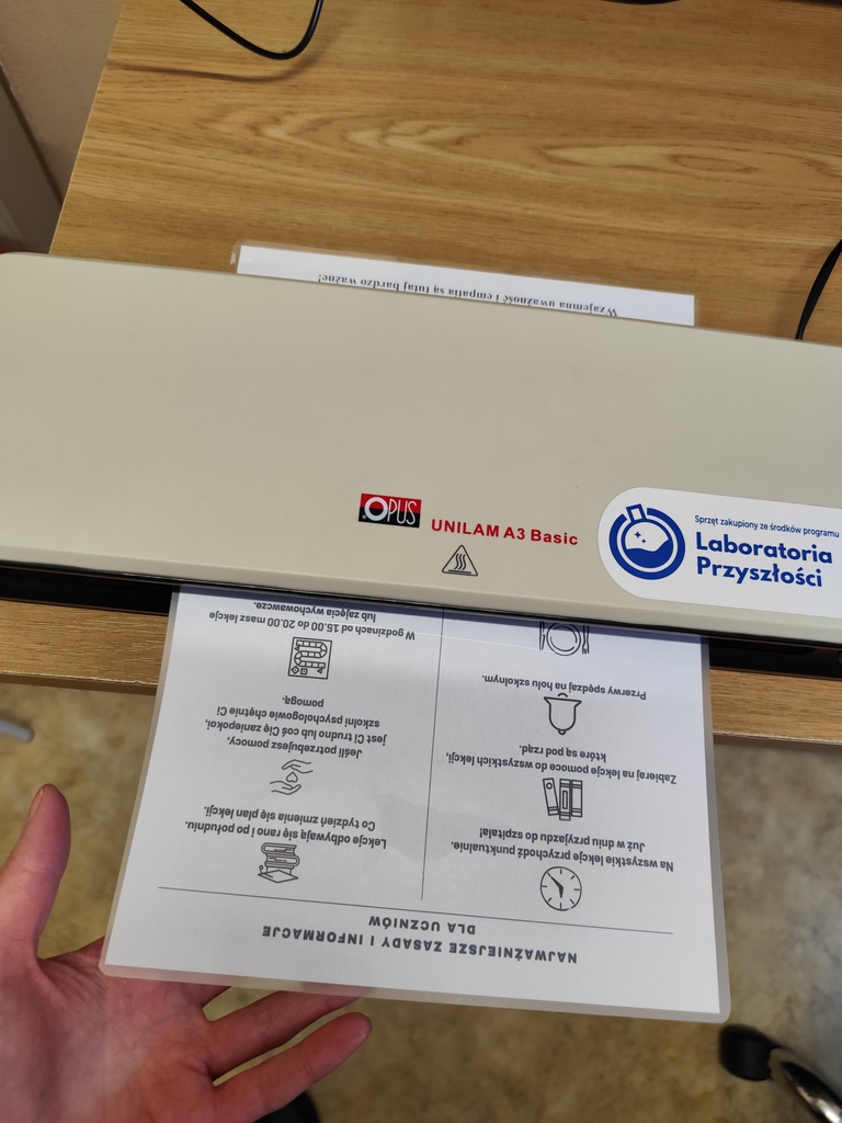 Podczas spotkania z psychologiem szkolnym sprzęt został wykorzystany w celach organizacyjnych. Laminatorka posłużyła do przygotowania, zabezpieczenia oraz estetycznego opracowania materiałów pomocniczych i informacyjnych, co wpłynęło na ich trwałość oraz czytelność.