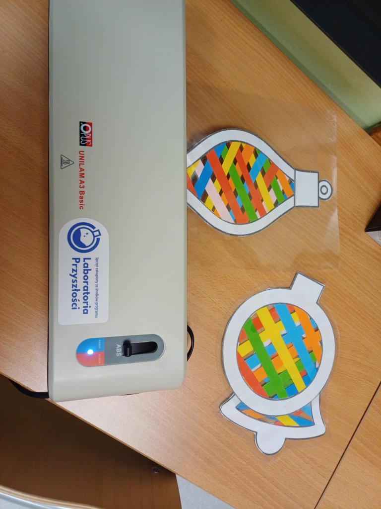 Dodatkowo laminatorka została użyta do przygotowania i zabezpieczenia ozdób świątecznych, które następnie posłużyły do dekoracji sal lekcyjnych oraz korytarzy szkolnych, przyczyniając się do stworzenia świątecznej atmosfery w placówce.