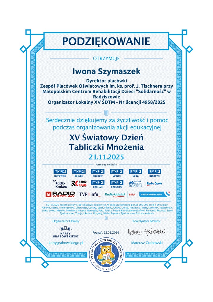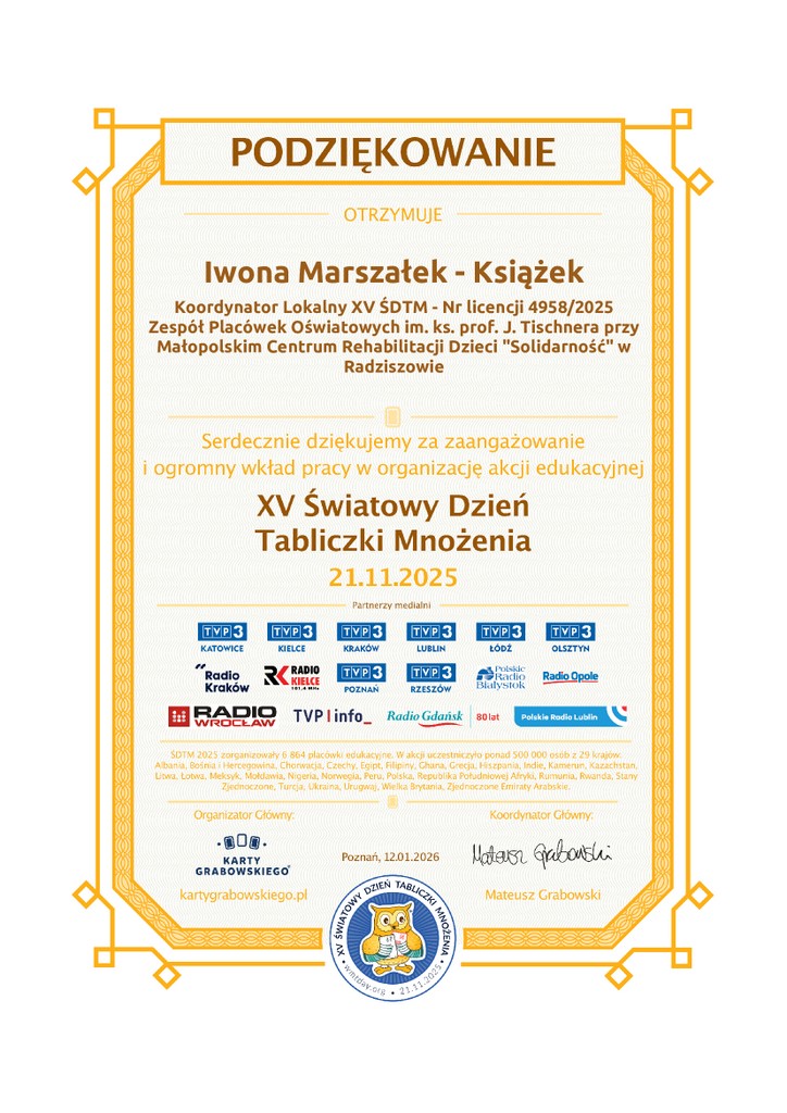 Miło nam poinformować, że otrzymaliśmy podziękowania od organizatora głównego Światowego Dnia Tabliczki Mnożenia za udział w XV edycji akcji.