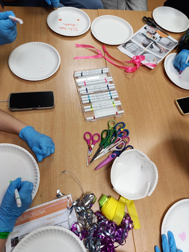Słodkie upominki wymagały wyjątkowej oprawy. Dlatego kolejnym etapem zajęć było przygotowanie ozdobnych pudełeczek, w których ciasteczka zostaną wręczone babciom i dziadkom. Każde opakowanie zostało wykonane samodzielnie – z dbałością o szczegóły, kolorystykę i estetykę.