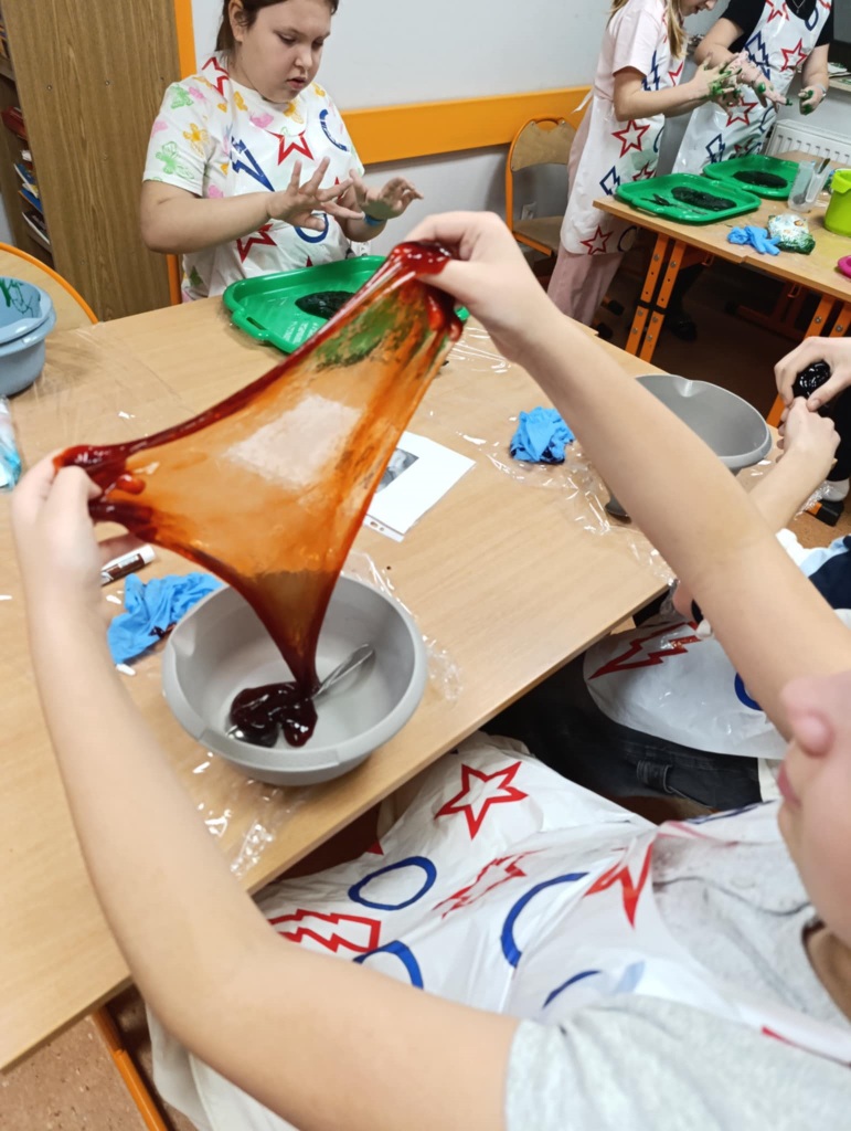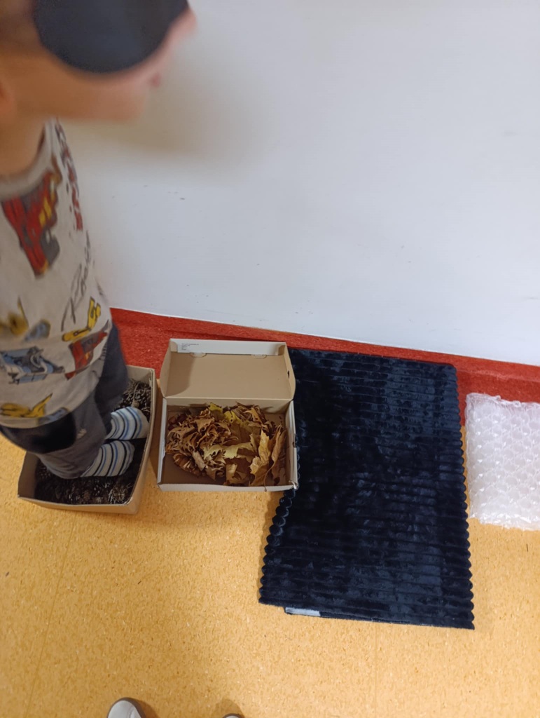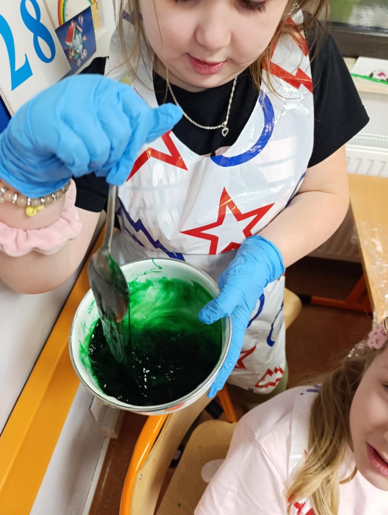 W części głównej zajęć uczniowie uczestniczyli w różnorodnych aktywnościach sensorycznych: rozpoznawali zapachy ukryte w woreczkach (iglaki, mięta, cynamon, goździki, suszone grzyby), łącząc je z wyobrażonymi fragmentami leśnego krajobrazu. Dużym zainteresowaniem cieszyła się także ścieżka sensoryczna złożona z szyszek, suchych liści, kamieni i mchu, po której dzieci przechodziły boso lub w skarpetach, doświadczając różnorodnych faktur. Na koniec tworzyli leśne slimy w odcieniach zieleni i brązu, wzbogaconych zapachem lasu oraz drobnymi kamyczkami.