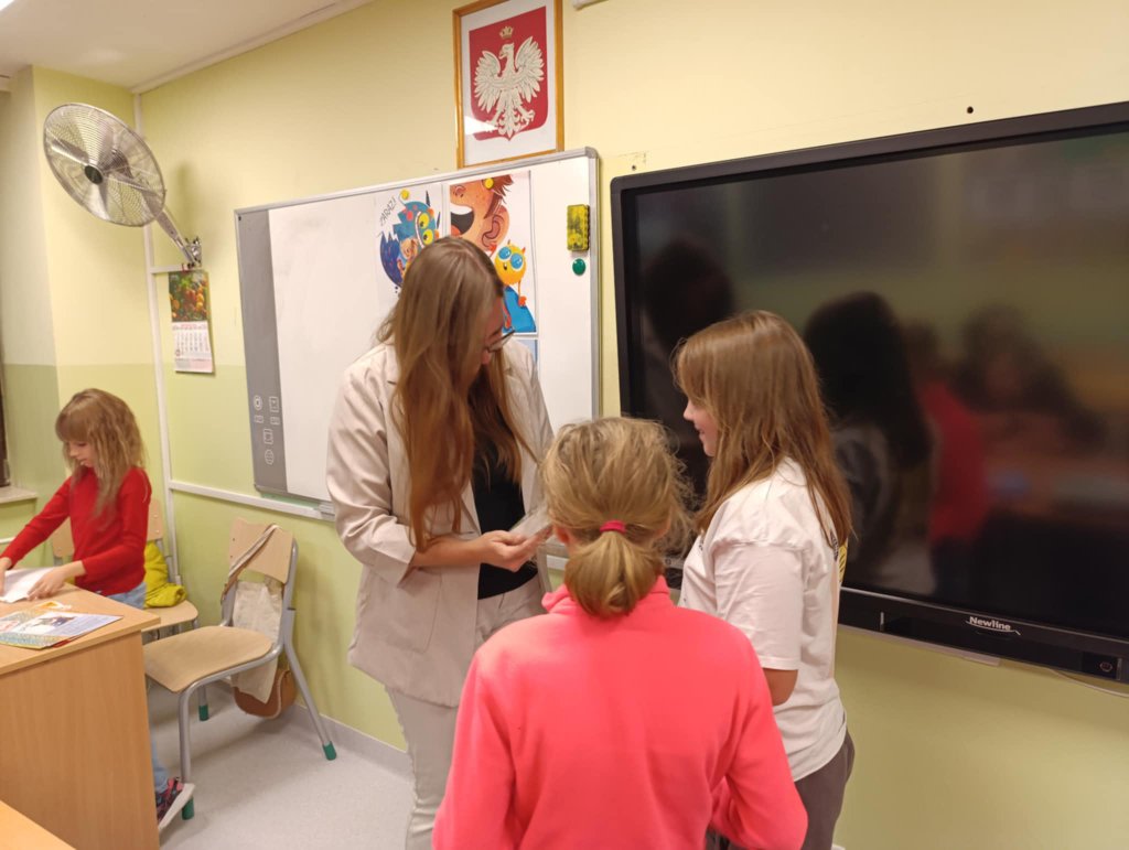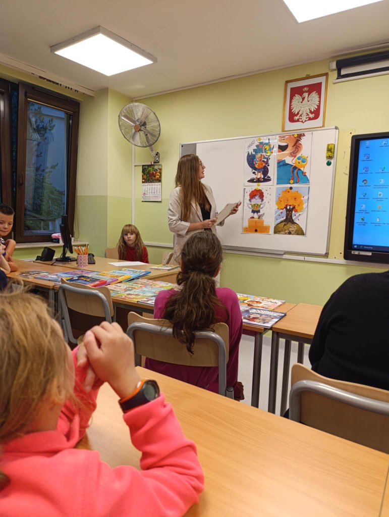 Już od pierwszych chwil w sali panowała ciepła i radosna atmosfera. Pani Aneta opowiadała o swojej pracy pisarskiej, zdradzała, skąd czerpie pomysły do swoich książek oraz jak wygląda proces powstawania historii – od pierwszej iskierki wyobraźni aż po gotową książkę w księgarni.