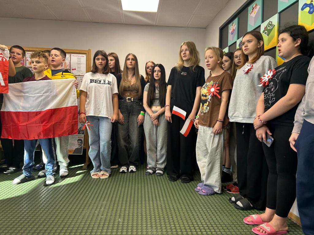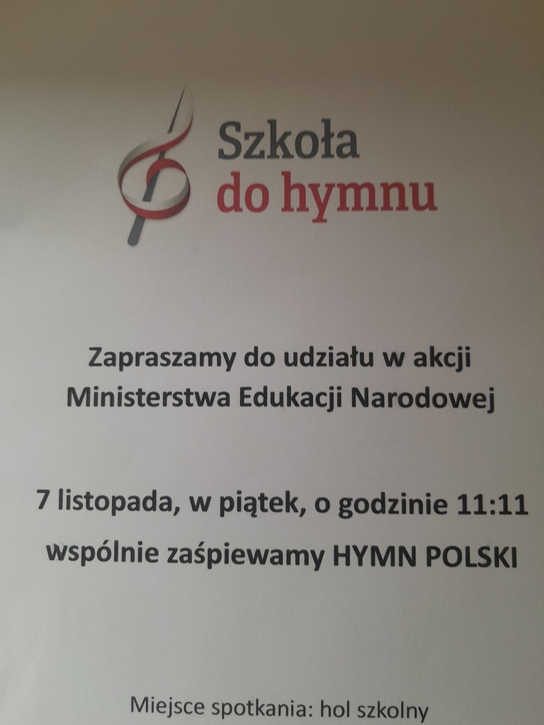 W naszej szkole śpiew hymnu poprzedzony był rozdaniem „patriotycznych” bransoletek, kotylionów i flag. Gdy wszyscy zajęli swoje miejsca, dwie uczennice przypomniały historię powstania hymnu oraz zasady obowiązujące w trakcie jego śpiewu. Następnie, dokładnie o godzinie 11.11, po komendzie „baczność!” i „ do hymnu!” cała społeczność pięknie wykonała tę pieśń nie zapominająco żadnej zwrotce. W nagrodę, na zakończenie wszyscy zostali poczęstowani czekoladkami.