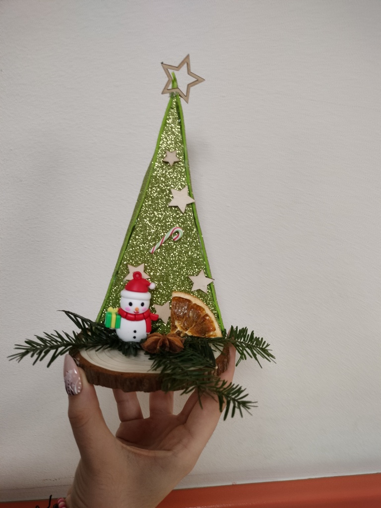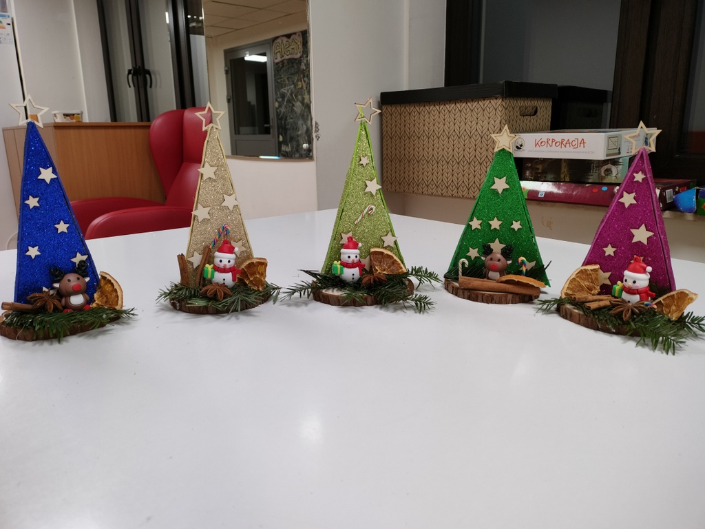 Uczniowie szkoły podstawowej przygotowali wyjątkowe, własnoręcznie wykonane upominki dla dzieci z oddziału przedszkolnego. Prace powstały z naturalnych i kreatywnych materiałów, takich jak tektura, pianka błyszcząca, drewniane gwiazdki, żywe gałęzie choiny, cynamon, gwiazdy anyżu oraz suszone pomarańcze. Kolorowe i pachnące ozdoby wprowadziły świąteczny nastrój oraz sprawiły wiele radości najmłodszym.