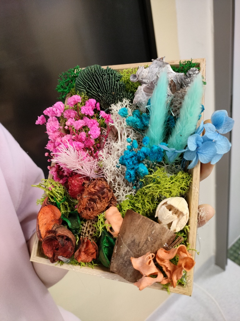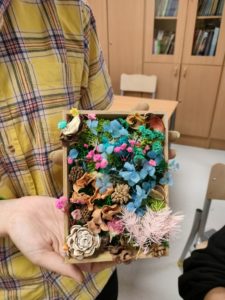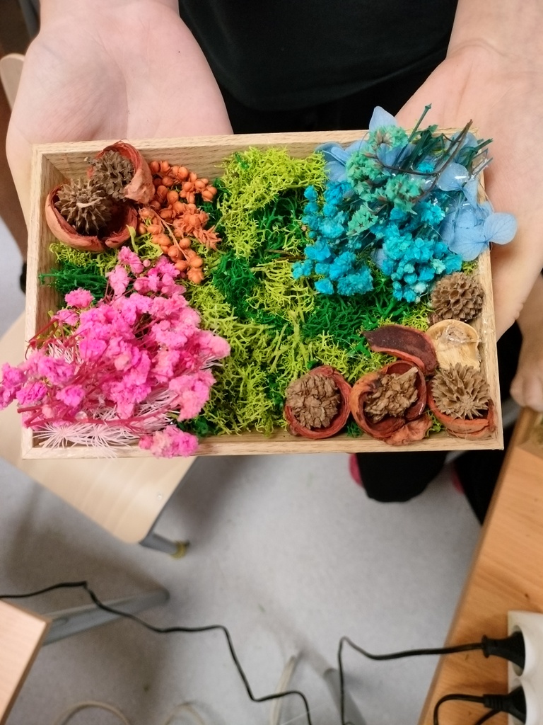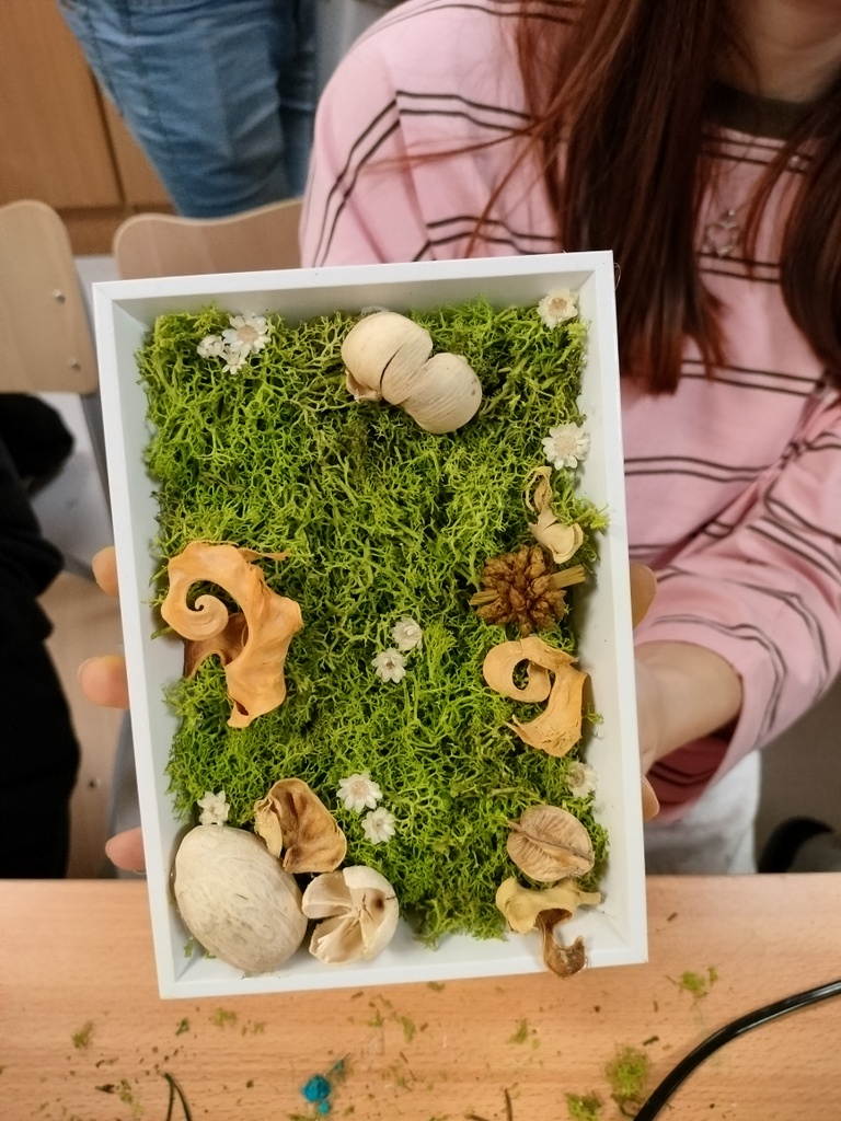 Podczas zajęć uczniowie poznali zasady pracy z naturalnymi materiałami oraz dowiedzieli się, w jaki sposób kontakt z roślinami wpływa na nasze samopoczucie i koncentrację. Praca z mchem sprzyjała wyciszeniu, rozwijała kreatywność i wrażliwość estetyczną.